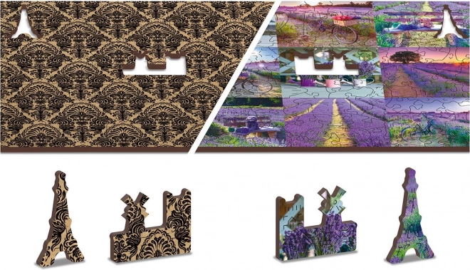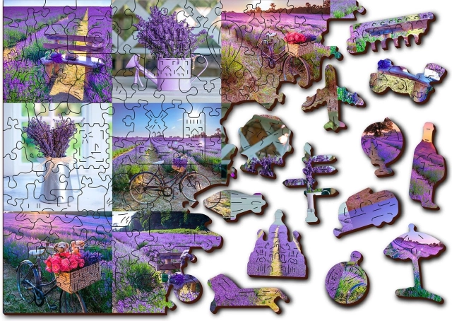 Setzen Sie das Puzzle nach dem farbigen Bild der Lavendelfelder zusammen oder probieren Sie die Rückseite mit einem wiederkehrenden Muster – ideal für reines Formenpuzzeln.