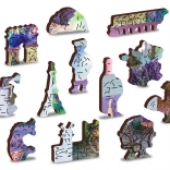 Ein Teil der Puzzleteile ist in Form von Tieren, Bauwerken oder Objekten gefertigt, mit hervorgehobenen Laser-Details.
