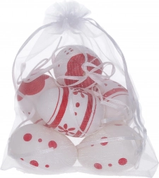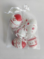 Dekorative, bemalte Plastikeier in der Größe von 6 cm sind ideal für Ihre festlichen Dekorationen. Sie erhalten 6 Stück in einem eleganten Organzasäckchen.
