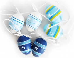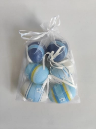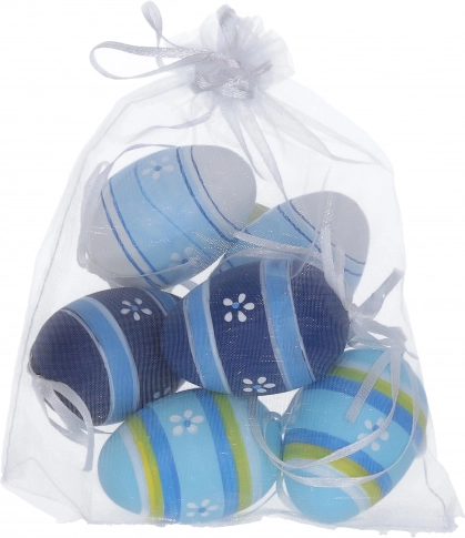 Dekorative Plastikeier, die Ihr Zuhause verschönern. Jedes Ei misst 6 cm und die Verpackung enthält 6 Stk in einem eleganten Organzabeutel.