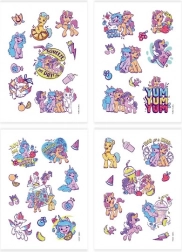 Genießen Sie Spaß und kreatives Verzieren mit temporären Tattoos MY LITTLE PONY. Das Set enthält 4 Bögen voller bunter Motive der beliebten Ponys, die sich mit Wasser leicht auftragen und ebenso einfach entfernen lassen. Eine tolle Wahl für Kinder ab 3 Jahren, für Partys und den Alltag.