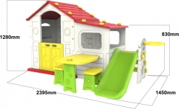 Abmessungen des Gartenhäuschens: Höhe 128 cm, Gesamtlänge 239,5 cm und eine Breite von 108 cm, was ausreichend Platz für Kinder verschiedenen Alters bietet.