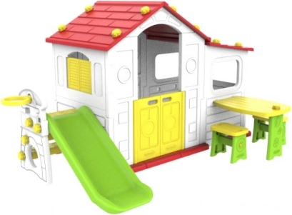 Das Haus beinhaltet ebenfalls einen Basketballkorb, der Kindern zusätzliche Möglichkeiten für aktives Spielen und sportliche Betätigung bietet.