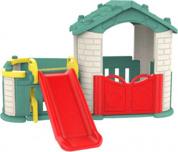 Das Haus bietet eine große Spielfläche mit großen öffnenden Türen. Eine doppelwandige Rutsche und robuste Treppen bieten Sicherheit und Stabilität während des Spiels. Das Haus enthält einen Vorgarten, der mit einem Zaun und einem Eingang zum Haus begrenzt ist, was zusätzlichen Raum für kreatives Spielen bietet.