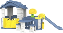 Das Spielhaus enthält eine Rutsche, einen Basketballkorb und weitere Spielelemente, die die körperliche Aktivität und Kreativität der Kinder fördern.