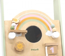 Der Holz-Schiebelauflernwagen PolarB Viga wurde so gestaltet, dass er Kinder sicher bei ihren ersten Schritten begleitet und gleichzeitig zum Entdecken motiviert. Das Frontpanel bietet zahlreiche Aktivitäten – von drehenden Zahnrädern über Schiebelabyrinthe bis hin zu Formensortierung und Spiegel, die Sinne und logisches Denken spielerisch fördern.