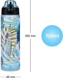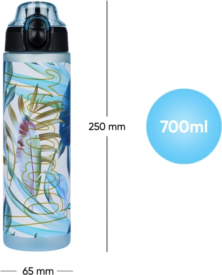 Stylische und gesundheitlich unbedenkliche Wasserflasche aus zertifiziertem Tritan für die tägliche Hydration. Sie hat ein Fassungsvermögen von 700 ml, einen verriegelbaren, auslaufsicheren Deckel mit Schnellöffnung und eine Schlaufe für bequemes Tragen. Das Material ist frei von BPA, PVC und Phthalaten, nimmt keine Gerüche an und ist ideal für Schule, Arbeit, Sport und Ausflüge.