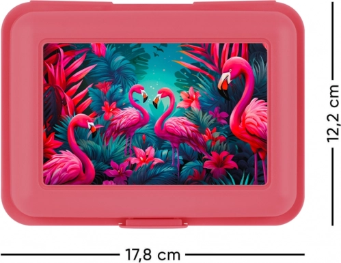 Stilvolle und praktische Brotzeitbox mit Flamingo-Motiv, ideal für den täglichen Gebrauch in Schule oder Arbeit. Hergestellt aus robustem Kunststoff mit leichtem Verschluss.