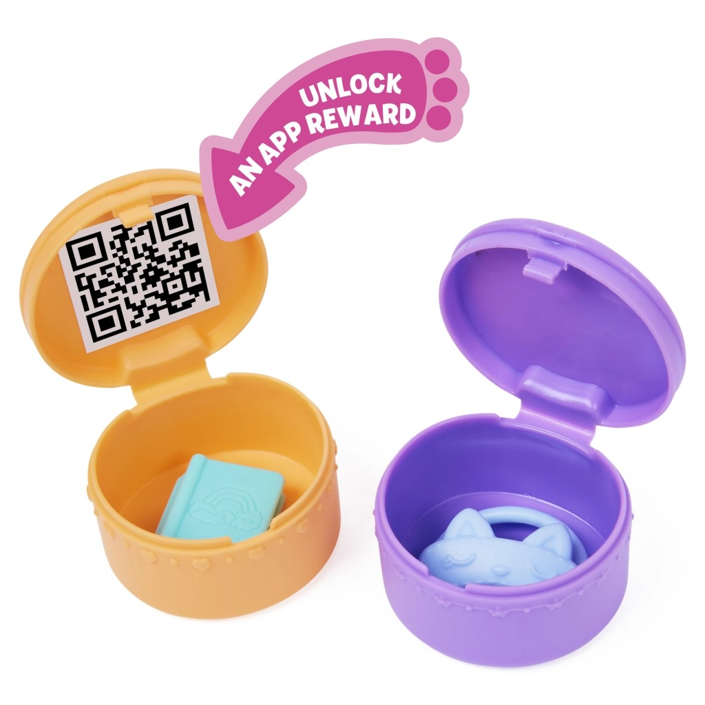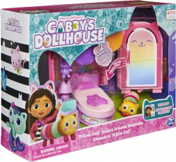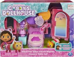 Tauche ein in eine Welt voller Fantasie und kuscheliger Träume mit dem Schlafzimmer-Set aus Gabby’s Dollhouse. Beim Auspacken erwarten dich die Sammlerfigur Pillow Cat, drei Möbelstücke und ein niedliches Plüschkissen. Öffne die Katzenpost und entdecke zwei Überraschungen: ein aufklappbares Buch und eine Schlafmaske für Pillow Cat.