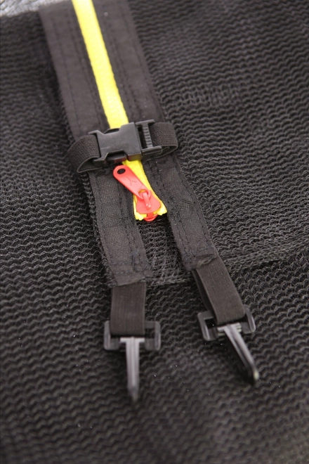 Der Eingang ist mit einem beidseitigen Reißverschluss mit auffälliger Einfassung und Sicherheits-Schnallen ausgestattet, die die Öffnung während des Springens sicher geschlossen halten. Das Netz wird schnell und einfach mittels Gurten an den schaumstoffummantelten Pfosten montiert und stellt sicher, dass Springer innerhalb der Sprungzone bleiben.