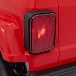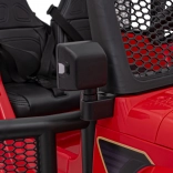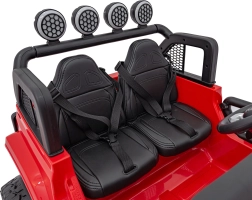 Zwei separate Sitze aus Kunstleder mit Sicherheitsgurten bieten Komfort für kleine Fahrer. Für ein realistisches Erlebnis sorgen vordere und hintere LED-Lichter, eine beleuchtete Starttaste und zu öffnende Türen. Das Audio-Panel mit MP3-, USB- und AUX-Eingang spielt Lieblingslieder ab, während die Tasten am Lenkrad Hupe und Melodien bieten.