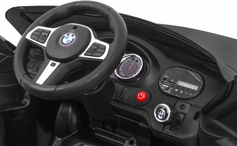 Das kindgerechte Cockpit mit BMW-Lenkrad, beleuchtetem Startknopf und übersichtlichem Panel bietet ein authentisches Fahrerlebnis und einfache Bedienung auch für die Kleinsten.