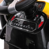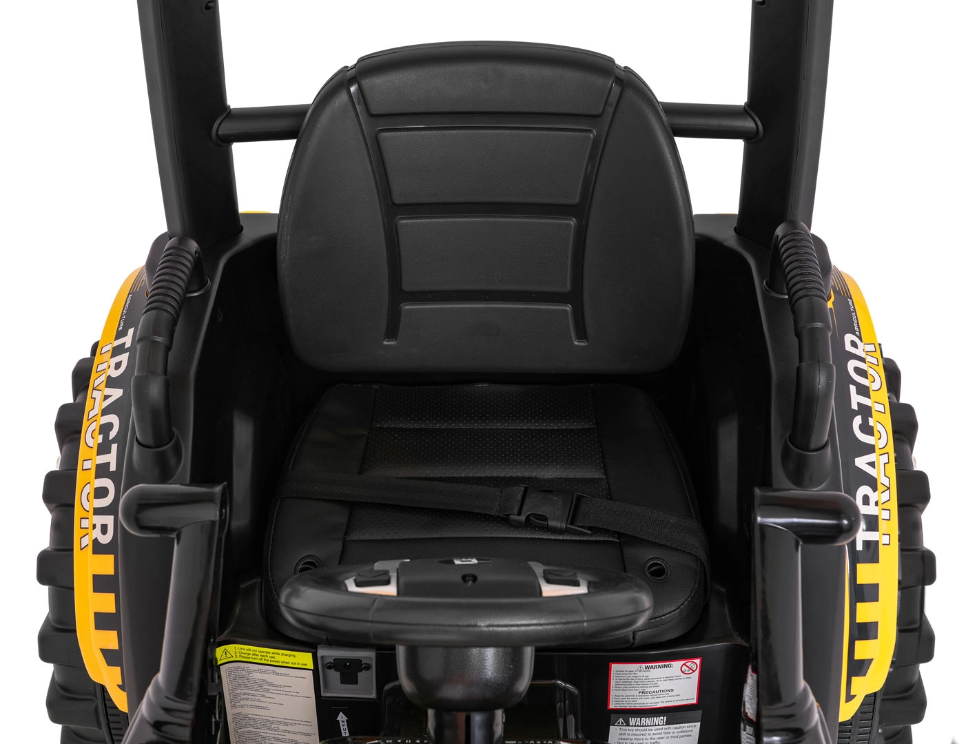 Sicherheit steht an erster Stelle dank der 2.4G-Fernbedienung mit Stop-Taste für sofortiges Anhalten. Komfort bietet der breite Sitz aus Ökoleder sowie die übersichtliche Bedienung. Für Unterhaltung sorgt das Audio-Panel mit MP3, USB, Bluetooth, integrierten Melodien und Lenkradgeräuschen. Vordere LED-Lichter verleihen einen realistischen Look und bessere Sichtbarkeit.