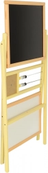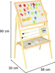 Die Tafel ist aus Holz gefertigt, was Stabilität und Langlebigkeit gewährleistet. Dank der kompakten Abmessungen (30 x 56 x 90 cm) passt sie in jedes Kinderzimmer, jeden Kindergarten oder jede Klasse. Ein praktisches Ablagefach für Zubehör sorgt während des Spielens für Ordnung.