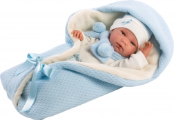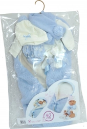 Stilvolles 5-teiliges Bekleidungsset für Puppen NEW BORN in der Größe 40–42 cm der Marke Llorens. Enthält ein kuschelweiches Set mit Schnellwickeldecke mit Kapuze, Mützchen und aufeinander abgestimmten, blauen Accessoires. In Spanien handgefertigt aus hochwertigen Materialien für Komfort, Realismus und Langlebigkeit. Praktische Verpackung im Kunststoffbeutel mit Kleiderbügel. Ideal für Kinder ab 3 Jahren.