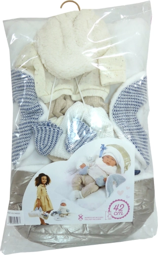 Alles Nötige in einem Paket: aufeinander abgestimmte Kleidungsteile und eine weiche Auflage mit Kapuze für die tägliche Pflege der Puppe.