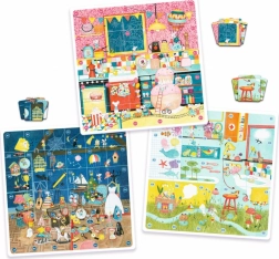Das Spiel enthält drei verschiedene thematische Spielpläne: Badezimmer, Küche und Dachboden. Jeder dieser Pläne bietet unterschiedliche Schwierigkeitsgrade, sodass Sie je nach Zusammensetzung und Fähigkeiten der Spieler wählen können. Der Erzähler zeigt seine Fähigkeiten bei der Beschreibung der kleinen Karten, damit die anderen die richtige Position auf den großen Spielplänen finden.