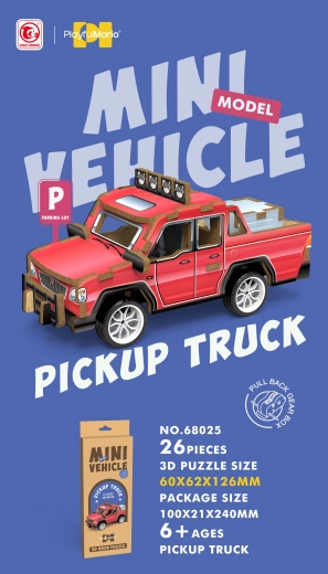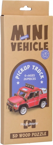 Bauen Sie ein 3D Holzmodell Pickup mit 26 Teilen und Rückzugmechanismus. Alter 6+, Abmessungen 13x6,2x6 cm.