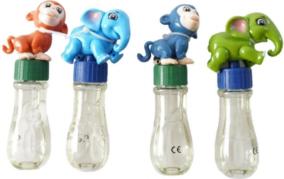 Fläschchen mit Seifenblasenflüssigkeit und Stab, Deckel mit Tierfigur