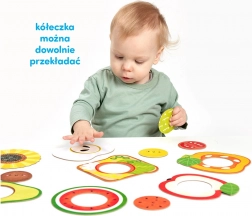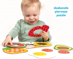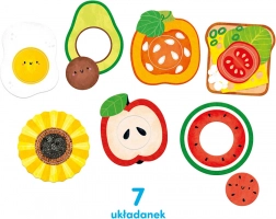 Das Spielen mit dem Puzzle fördert ganz natürlich die Feinmotorik, die Wahrnehmung und die Geduld. Gemeinsam könnt ihr Lebensmittel, Farben und Formen benennen, Ähnlichkeiten und Unterschiede suchen und Fragen erfinden wie „Was hat Kerne?“ oder „Wo ist das Ei?“. Ältere Kinder nutzen die Teile auch für Rollenspiele wie Laden oder Kochen oder als Inspiration für eigene Bilder.