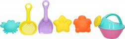 Sandset mit Gießkanne bietet alles Notwendige für Spaß im Sandkasten. Es enthält eine Gießkanne, ein Sieb, eine Schaufel und drei Förmchen, ideal für kleine Kinder.