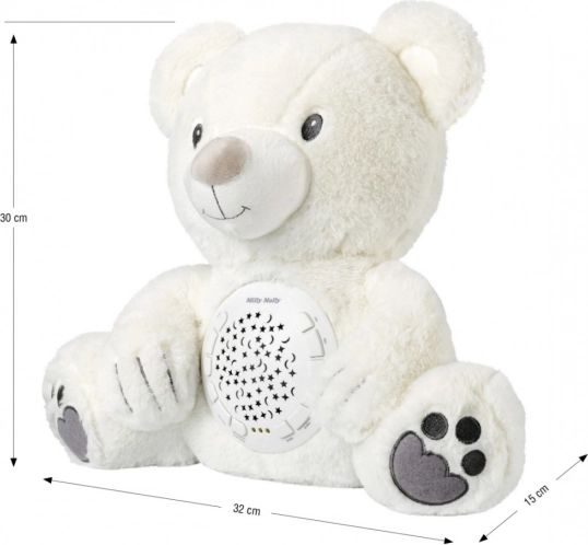 Plüschspielzeug mit Projektor Milly kombiniert weichen Plüsch mit beruhigendem Nachtlicht und sanften Melodien. Erleuchten Sie das Kinderzimmer mit einem Nachtlicht und ruhigen Klängen, die Ihrem Kind helfen, einzuschlafen.