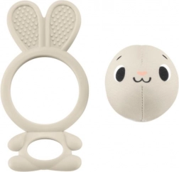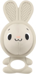 Silikonhäschen mit strukturierten Ohren und Öffnung für den sicheren Griff des Babys. Die abnehmbare Klingelkugel motiviert zur Bewegung und fördert die Feinmotorik.