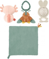 Entdecken Sie sinnliches Spielvergnügen für Neugeborene mit dem Geschenkset FISHER‑PRICE Sinneswelt. Im Set finden Sie 4 niedliche Spielzeuge: BPA‑freies Silikon‑Hasen-Beißspielzeug, weichen Axolotl mit Glöckchen, taktile Rassel‑Schmetterling mit Clip und weiches Knisterpanel mit Band. Die Spielzeuge liegen leicht in kleinen Händchen, fördern die Feinmotorik sowie die Entwicklung von Sehen, Hören und Tastsinn. Der Clip ermöglicht das Befestigen am Kinderwagen, an der Tasche oder an der Spielmatte – ideal auch für unterwegs.