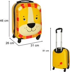 Der niedliche Kinderkoffer mit Löwenmotiv ist ideal als Handgepäck für kleine Reisende. Er hat ein robustes Hartschalen-Design aus Kunststoff, vier Rollen für leichtes Führen und einen Teleskopgriff. Innen bietet er zwei Fächer – eine Reißverschlusstasche und einen Bereich mit Kreuzspanngurten – so passen Kleidung und Lieblingsspielzeug bequem hinein.