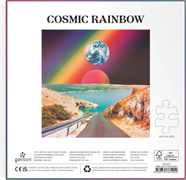 Tauchen Sie mit dem GALISON Puzzle Cosmic Rainbow mit 500 Teilen in eine Welt voller Farben und Fantasie ein. Die surreale Landschaft mit Regenbogen, Planeten und einem Küstenweg schafft eine ausdrucksstarke künstlerische Szene, die sowohl Anfänger als auch erfahrene Puzzler erfreut. Dank des hochwertigen Drucks und der stabilen Teile ist das Puzzeln flüssig und zufriedenstellend.