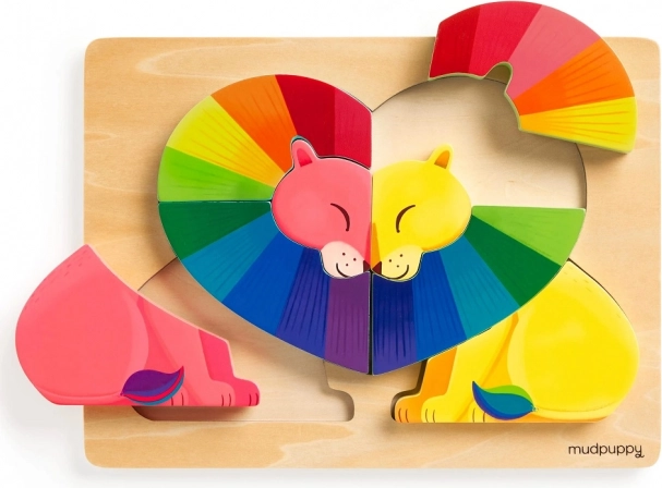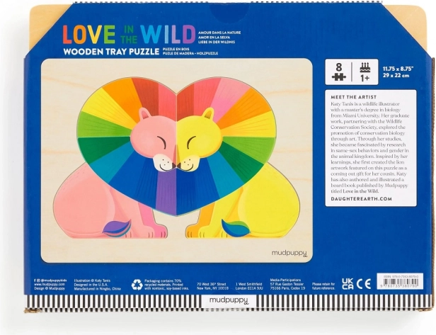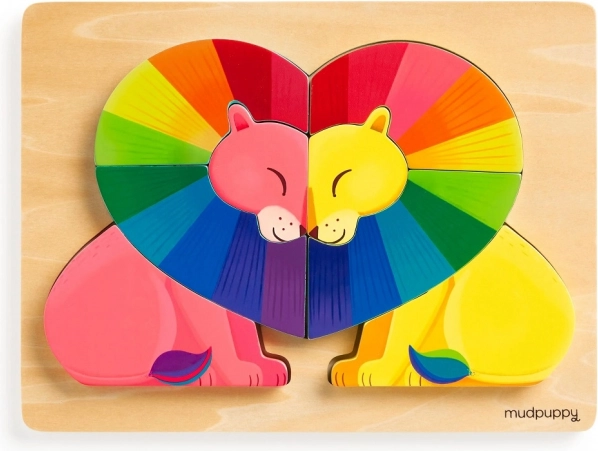 Holzpuzzle Liebe in der Wildnis von der Marke Mudpuppy bietet Kindern nicht nur Spaß, sondern auch Einblicke in Liebe und Vielfalt durch ikonische Kunst der Regenbogenlöwen.