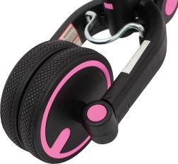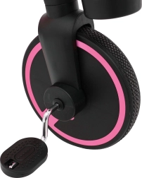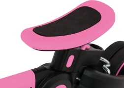 Gummigriffe mit rutschfester Oberfläche und ein schaumstoffgepolsterter Sattel mit zweistufiger Einstellung (28–30 cm) erhöhen den Komfort. Gummiräder (vorn 22×3,5 cm, hinten 17×3,5 cm) mit Profil halten zuverlässig die Spur, und der Freilauf mit der Möglichkeit, die Pedale abzunehmen, ermöglicht dem Kind ein sicheres Abstoßen.
