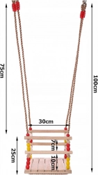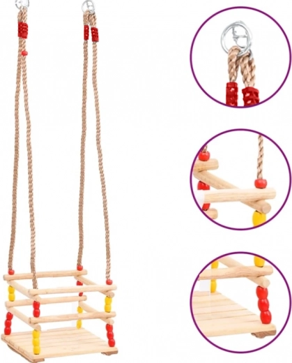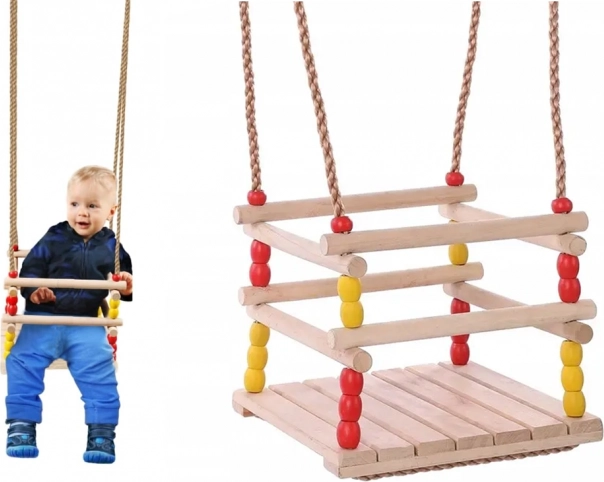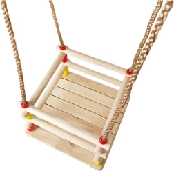 Diese Holzschaukel mit einem Sitz von 30 × 30 cm und vorderem Sicherheitsbügel ist für kleine Kinder konzipiert. Dank glatt geschliffenem Holz ist das Sitzen bequem und angenehm anzufassen. Nach entsprechender Imprägnierung eignet sie sich für Innen- und Außenbereich – Sie hängen sie an einen Baum, eine Pergola oder eine freistehende Konstruktion.