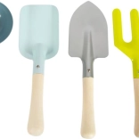 Sechs robuste Werkzeuge (Schaufeln, Spaten, Schöpfer, Harke und Forke) mit Holzgriffen sind speziell für kleine Gärtner entworfen.