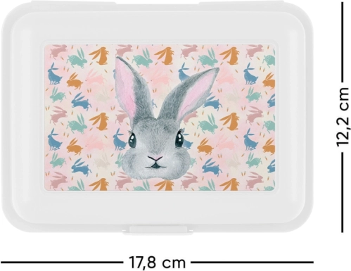 Das minimalistische Design in Weiß wird von einem charmanten Bunny-Motiv ergänzt, das Kinder und Liebhaber verspielter Details gleichermaßen erfreut. Die Box ist leicht, einfach zu transportieren und passt in Schulrucksack wie Handtasche.