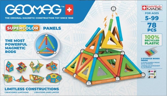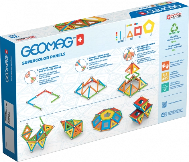 Das Geomag Supercolor Panels Set verbindet Spielspaß und Lernen perfekt. Starke Magnetstäbchen und Metallkugeln ermöglichen stabile Verbindungen, farbige Paneele verstärken und verzieren die Konstruktionen. Beim Spielen entwickeln Kinder ihre Vorstellungskraft, lernen Grundlagen der Physik und Geometrie und trainieren die Hand-Auge-Koordination.