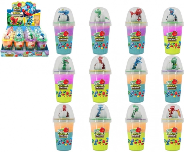 Entdecken Sie verschiedene Schleimfarben und Dinosaurierfiguren. Die Kollektion bietet 12 attraktive Motive für Sammelspaß.