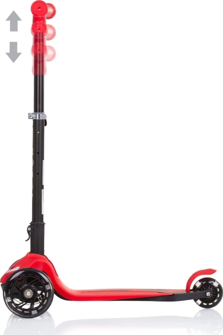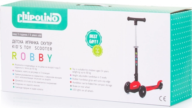 Der Robby-Roller zeichnet sich durch einen leichten Aluminiumrahmen aus, der eine einfache Handhabung garantiert. Er ist geeignet für Kinder ab 3 Jahren und hat eine Tragfähigkeit von bis zu 50 kg. Dank gummierter, rutschfester Griffe und breitem Trittbrett bietet er mehr Sicherheit und Komfort beim Fahren. Der Roller ist mit vorderen und hinteren Rädern mit bunten LED-Lichtern ausgestattet, die Sichtbarkeit auch im Dunkeln gewährleisten. Der Lenker ist in drei Positionen verstellbar und kann zum einfachen Verstauen zusammengeklappt werden. Eine Trittfeststellbremse am hinteren Rad dient zum Anhalten.
