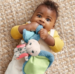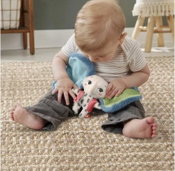 Das sensorische, kuschelige Spielzeug in Elefantenform bietet reichhaltige haptische Reize: weicher Plüsch, satinierte Details und knisternde Elemente. Kontrastierende Blau‑ und Grüntöne ziehen die Aufmerksamkeit auf sich und fördern die visuelle Entwicklung, während leicht zu greifende Formen die Feinmotorik und die Hand‑Augen‑Koordination trainieren.