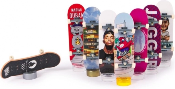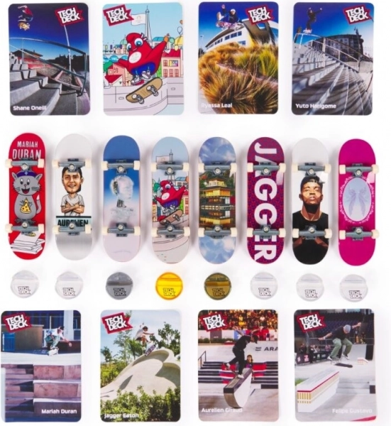 Jedes Fingerboard in dieser Kollektion hat ein authentisches Design von weltweit bekannten Skatefirmen. Ebenfalls enthalten sind 8 Sammelkarten, die ausgewählte Skateboarder bei akrobatischen Tricks zeigen. Stellen Sie Ihre Fingerboards auf Ständer mit goldenen, silbernen und bronzenen Halterungen und präsentieren Sie Ihre Schmuckstücke mit Stolz.