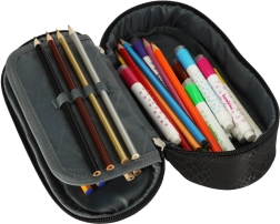 Elegantes schwarzes Etui mit strukturierter Schlangenoptik – ideal für Schüler, Studenten und Profis. Es bietet eine clevere Raumaufteilung, die die Organisation von Buntstiften, Stiften und kleinen Accessoires erleichtert. Der verstärkte Korpus hält die Form und schützt den Inhalt im täglichen Einsatz.