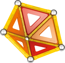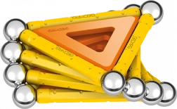 Lieferumfang: 12 gelbe Magnetstäbe, 12 Stahlkugeln, 8 dreieckige Paneele, 2 quadratische Paneele, 1 orangefarbenes Paneel in Fünfeck-Form sowie eine Kunststoffbox für Kugeln und Stäbchen.