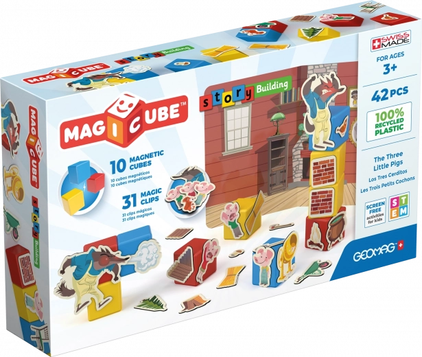 Geomag Magicube Die drei kleinen Schweinchen ist ein kreatives magnetisches Bauset, das das Vorlesen des Märchens mit interaktivem Bauen verbindet. Dank der Magnete an allen Seiten der Würfel setzen Kinder Figuren, Häuschen und Szenen mühelos zusammen und fördern Feinmotorik, Fantasie und logisches Denken.