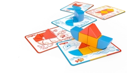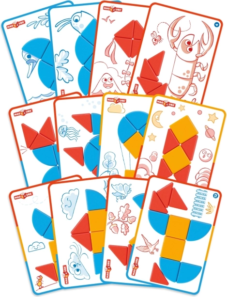 Enthalten sind 6 beidseitig bedruckte Karten mit 12 Aufgaben, die von einfachen Puzzles zu fortgeschritteneren Formen führen und logisches Denken anregen.