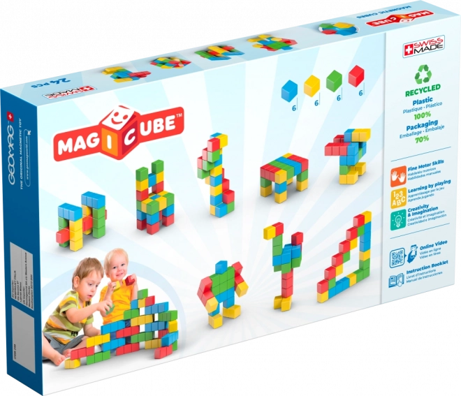 Dank der speziellen inneren Konstruktion ziehen sich die magnetischen Bausteine von allen sechs Seiten an und halten sogar frei im Raum – Bauen in 3D. Enthält 24 Würfel in vier Farben. Geeignet ab 1 Jahr.