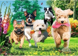 Verspielte Hunde in einem blühenden Garten bringen Energie, Emotionen und eine detailreiche Illustration, die sowohl Einsteiger als auch erfahrene Puzzlefans begeistert.