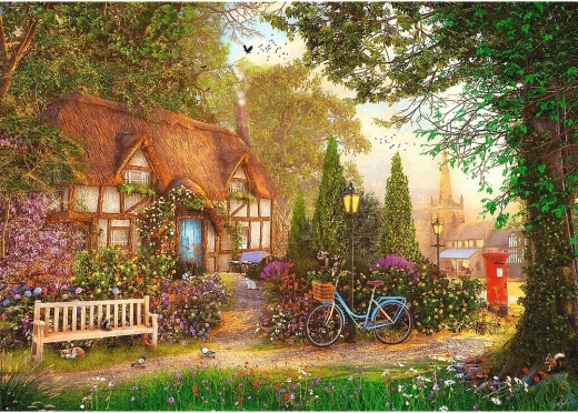 Entdecken Sie das Premium Plus Puzzle „Teezeit - Häuschen unter dem Strohdach“ von Trefl. 1000 Teile voller Herausforderung und Spaß, ideal für Puzzle-Fans.