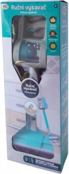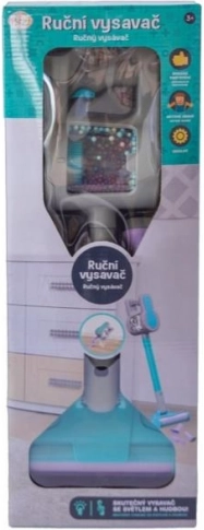 Handstaubsauger mit austauschbaren Aufsätzen. Der Staubsauger ist batteriebetrieben und erzeugt Sauggeräusche. Jede Hausfrau wird diesen Staubsauger lieben. Er ist immer griffbereit.