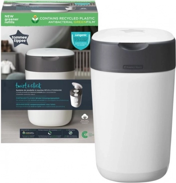 Hygienisch und geruchsfrei: Der antibakterielle Bestandteil der Folie zerstört 99 % der Bakterien, während der Zitronenduft der Folie das Kinderzimmer vor Gerüchen schützt. Dank der Twist & Click Technologie lässt sich die Windel durch Drehen des Mechanismus unter dem Deckel leicht in die Folie einwickeln.