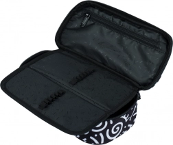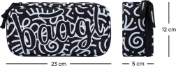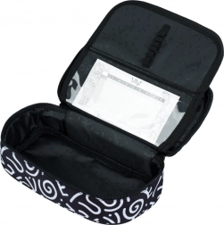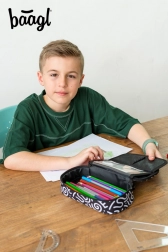 Das Mäppchen besticht durch ein schwarz-weißes Textil-Design mit abstrakten Mustern und der Aufschrift 'Baagl'. Sein stylisches Design ist ideal für diejenigen, die auch bei Schulbedarf auf Mode achten.